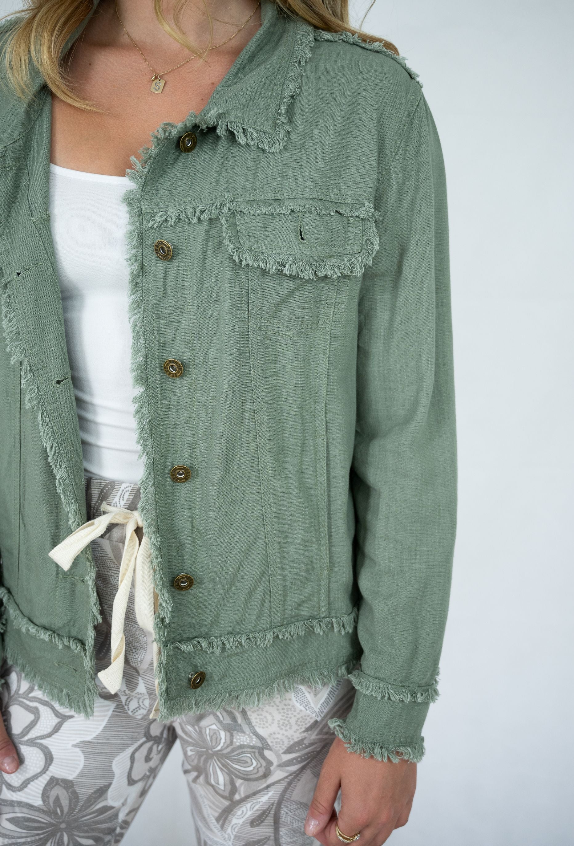 Be the talk of the town in our Fringe Jacket! With a stylish collared neck, full cuff sleeves, and a fringe hems, this jacket adds some serious boho chic to your wardrobe. Its regular fit and hip length give a flattering silhouette, while the linen fabric adds breathability and comfort.