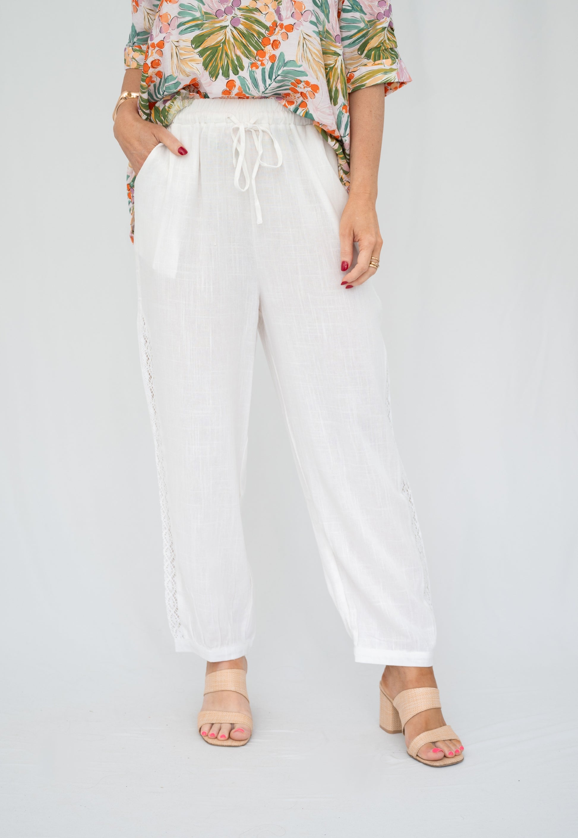 Light, lace, and breezy — these viscose-linen pants fall with a soft drape, with their delicate lace tracing a delicate line along the length of each leg. Easy to wear and easy to love, they bring a touch of beauty to your everyday.