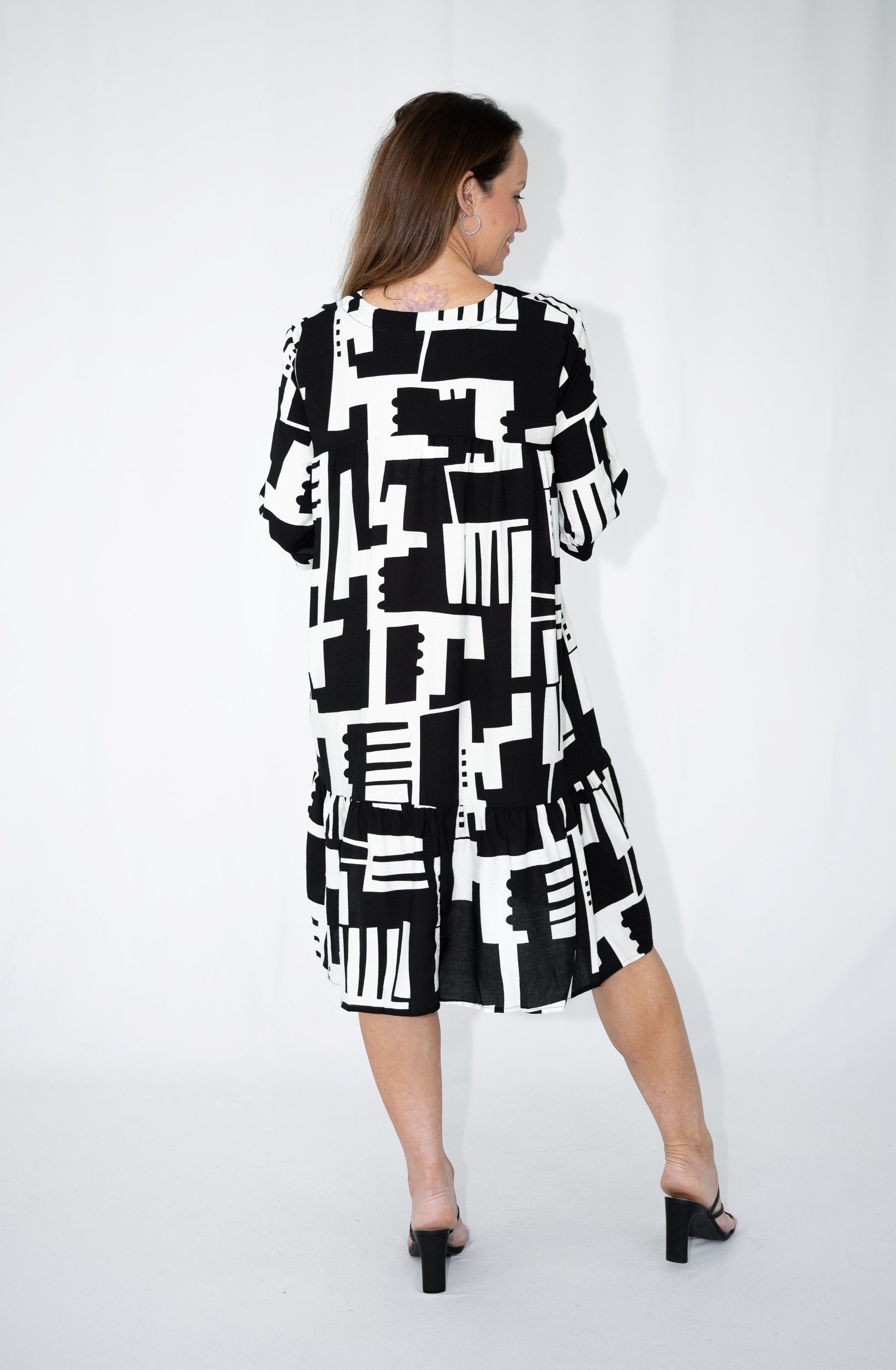 Bold, effortless and playful, this tiered dress features a striking monochrome abstract print with geometric edge—perfect for adding style to your everyday wardrobe.