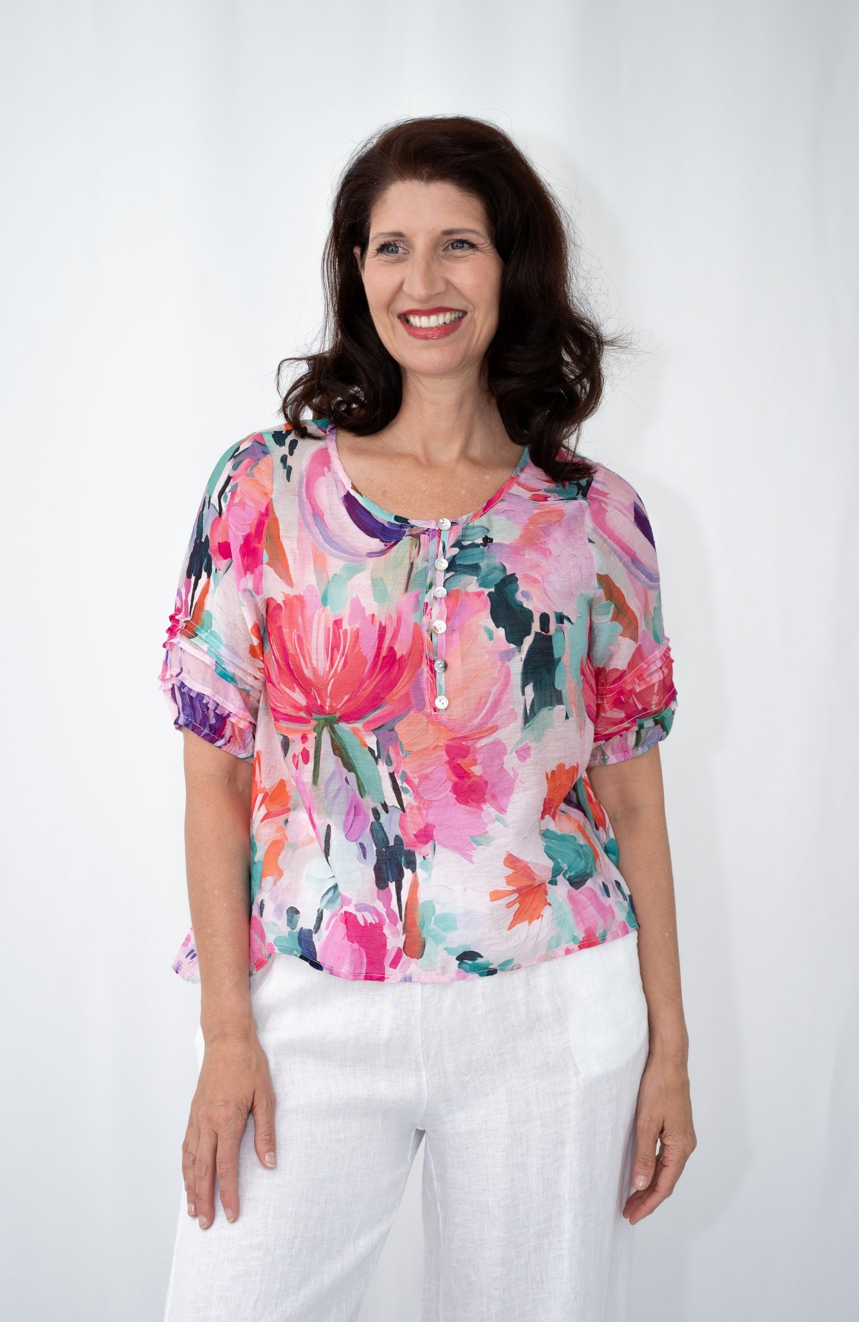 Bright, bold and artistic — this floral blouse brings cheerful energy to everyday dressing. With its painterly blooms, soft button front, and breezy silhouette, it’s the kind of piece you’ll reach for when you want colour without complication.