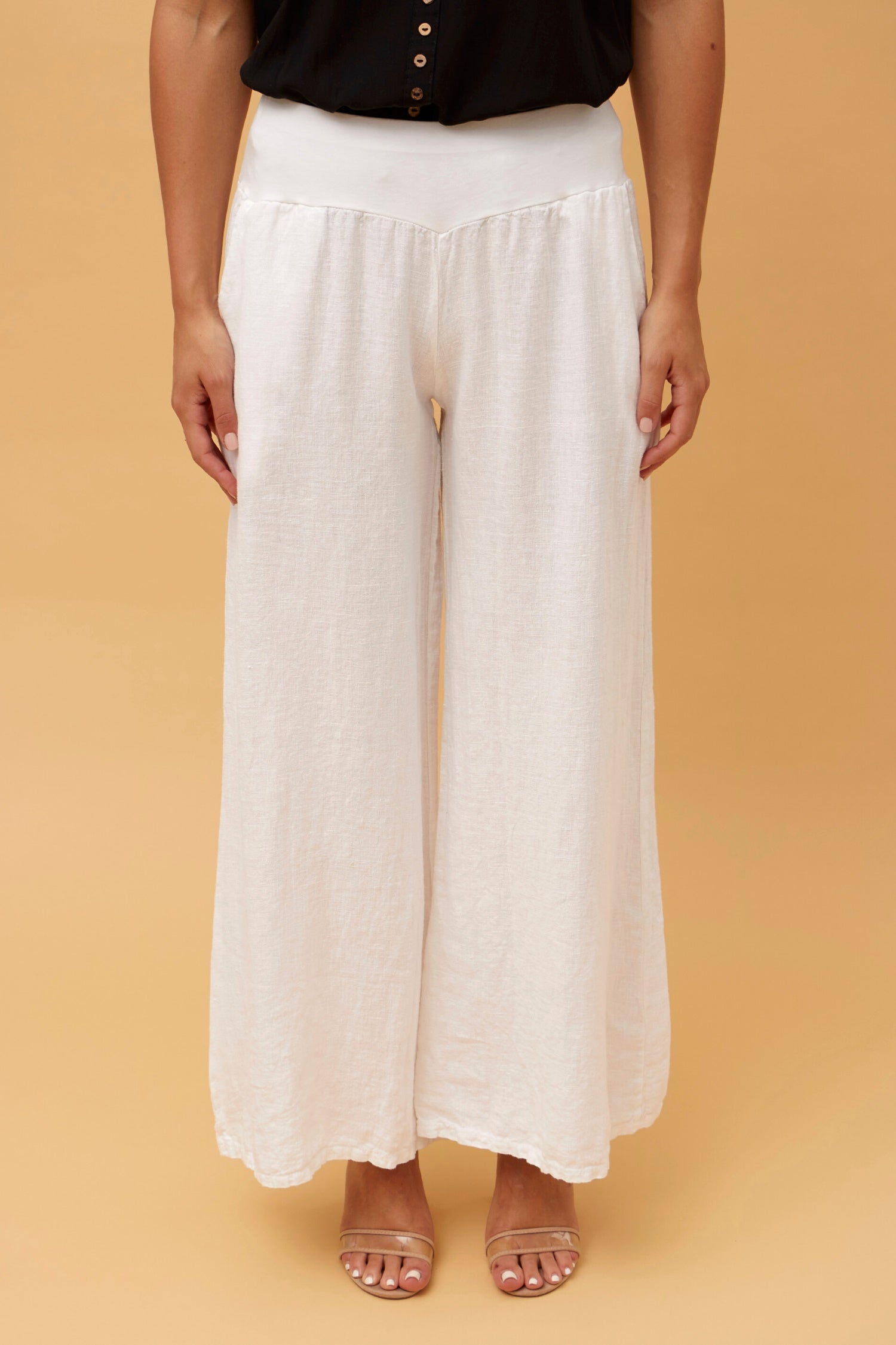 Fall in love with our Wide Linen Italian Pants! Made in Italy for effortless style and comfort. Featuring an flexible stretch waist, convenient side pockets, wide legs and relaxed fit in breathable linen, these pants are perfect for every occasion. Light, luxe and endlessly wearable!